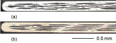 図 1 バリア線材の横断面写真 (a) Ca 2 CuO 3 バリア線材、 (b) SrZrO 3 バリア線材