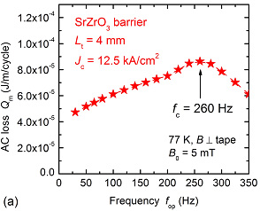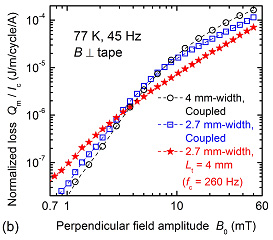交流磁界中での低損失化に向けては、実用に即したツイスト構造を有する線材において、結合周波数 f c (= 1/2 p t c ) を、運転周波数よりも十分に高い値に向上させることが重要な条件となる。 f c は損失中に含まれる結合損失 Q c (1 周期当たり ) が極大を示す周波数として評価することができ、線材断面形状が等価であれば横断抵抗率 r t とツイスト長 L t に対し r t / L t 2 に比例して増減する。バリア導入と L t の狭小化により、ジュネーブ大 (80-180 Hz) 、カールスルーエ工科大 (400-500 Hz) および豊橋技科大グループ (380 Hz) にて商用周波数よりも高い f c ( 垂直磁界下 ) が達成されてはいるものの、 J c はいずれも数 kA/cm 2 と大きく低下してしまっている。一般に高 r t を実現するためには、バリア導入厚をある程度厚くし、完成試料でのバリアの連続性を確保する必要がある。しかし、バリア材が厚すぎると線材全体として加工性が低下し、特にツイストした際に線材内の構造が大きく乱れ、特性劣化を引き起こす大きな要因となる。この問題の解決に向けて、バリア導入厚、線材のスリム化 (< 3 mm) およびツイスト加工法に関する改良をこのグループは進めており、最近の成果として、 J c > 12 kA/cm 2 (2.7 mm 幅、 L t = 4 mm) のバリア線材において、 f c > 250 Hz( 垂直磁界下 ) を達成することに初めて成功したことが 2010 年春季応用物理学会 (3/17-20: 東海大学 ) において稲田亮史助教より報告された ( 図 3(a)) 。これに伴い、 50 Hz 近傍での垂直磁界損失は、 10-50 mT の磁界範囲において、同一寸法でフィラメント同士が結合している線材と比較して 1/2 程度 (4 mm 幅線材と比較した場合、 1/3 程度の損失低減に相当 ) に低減することが確認されている ( 図 3(b)) 。