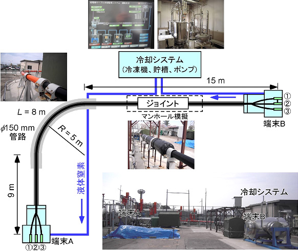 図 2 には、 30 m ケーブル検証試験線路のレイアウトおよび各部分の写真を示した。 90° 曲がりを有するレイアウトで、曲がり部は管路で構成されている。さらに超電導−超電導ジョイント、端末 A には超電導−常伝導ジョイント、電流リードおよびブッシングが設けられている。液体窒素は毎分 40 リットル程度の流量でポンプにより循環されており、 1 kW の冷凍機 2 台によってその温度が制御され、取材した際には全区間で 74 ~75 K に保たれていた。ちなみに旭変電所での実証試験では 6 台の冷凍機が使われる予定になっている。室温から運転温度まで約 2 日間で冷却できたとのことで、材料の熱収縮によって生じた張力 2.5 t が 3 心ケーブルコアに印加されているが特性の劣化は無い。また、超電導―超電導接続の部分は、ケーブルコアが向き合った配置となっており、導体層、シールド層ごとにそれぞれ超電導線材によって各コア同士が低抵抗で接続されている。コア接続部の長さは約 1 m 、ジョイントケースは 4 m 程度である。もちろん、この超電導―超電導接続には Albany プロジェクトでの経験が生かされている。