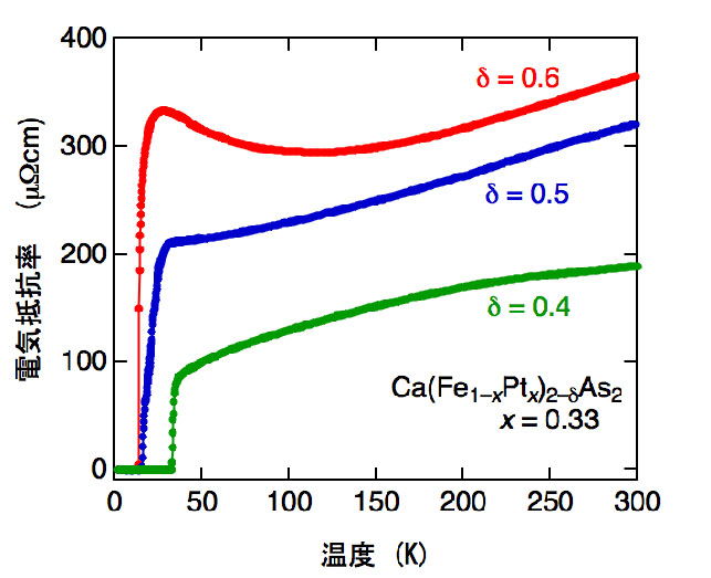 岡山大学の垣谷氏の講演によると、 122 型の CaFe 2 As 2 における Pt の固溶限界は 8% で、 Pt をドープした 122 は超伝導を示さない。固溶限界を超えて Pt ドープを試みたところ、鉄が欠損した新しい相 Ca(Fe 1- x Pt x ) 2- d As 2 が得られたという。最高の臨界温度 38 K は x =0.3, d = 0.4 の組成で得られている。また欠損量が増えると臨界温度は低下する。