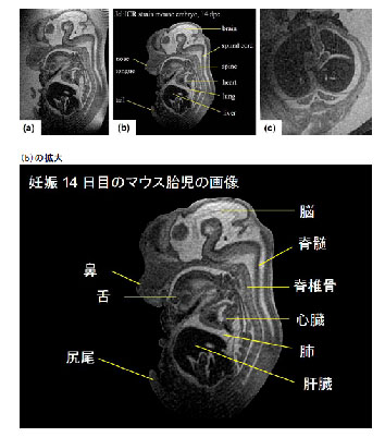 実際にこの磁石を MRI 測定へ組み込んで、ファントムと呼ばれる磁場評価用の直径 1 mm のガラス管を撮影した結果、おおよそ均一な磁場が形成されていることを確認した。さらに、植物のセロリ、マウス胎児の MRI 画像を撮影した結果、通常の MRI の空間分解能が mm 程度であるところ、セロリで空間分解能 100 m m 、マウスの胎児で空間分解能 50 m m ( 図 3) という高分解能を高感度で達成した。