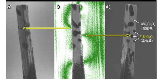 東北大学多元物質科学研究所、沖縄科学技術研究基盤整備機構 ( OIST ) 、理化学研究所、新日鉄先端技術研究所、日立基礎研究所のグループは、集束イオンビーム装置 ( FIB ) の走査イオン顕微鏡機能 ( SIM ) による組織観察と電子線ホログラフィー技術による磁束量子の追跡を組み合わせることで、一本の磁束量子が常伝導相の粒子に対応した形でピン止めされている様子を可視化することに初めて成功した。