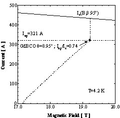 これまでの最高磁場は、 Bruker BioSpin 社の 1 GHz NMR マグネットが 2.2 K 以下の超流動ヘリウム温度で発生する 23.5 T であった。今回の成果は、 ( 独 ) 科学技術振興機構の研究成果展開事業「戦略的イノベーション創出推進プログラム」 (S- イノベ ) 研究課題名「高温超伝導材料を利用した次世代 NMR 技術の開発」において遂行中の、高温超伝導材料を超伝導マグネットおよび NMR プローブに応用した、次世代高温超伝導 NMR システム開発の過程で達成したものである。本研究は、 NMR マグネットを HTS 線材で製作してコンパクトにすることで、従来の低温超伝導 (LTS) 線材 NMR マグネットと同じ設置空間 ( 実験室等 ) に、より強磁場の NMR システムを導入することが目標である。マグネットをコンパクトにするためには、線材の臨界電流密度と耐電磁力特性の向上が求められる。このような要求に応えることのできる線材のひとつとして、 RE-Ba-Cu-O (REBCO) 線材が挙げられる。また、 HTS 材料による検出コイルを組み込んだ低温プローブの開発も行なわれており、 HTS 材料を用いて、マグネットをコンパクトにし、プローブ性能を向上させ、利便性と性能の両立を図ることが目標とされている。現在、 600 MHz (14 T) HTS NMR システムの開発が計画されている。 REBCO NMR マグネット開発のためには、 REBCO 線材によるレイヤー巻コイル製作技術の確立が必要であった。 REBCO 線材のようなテープ形状の線材の場合、パンケーキ巻でコイルが製作されるのが通常であるが、 NMR マグネットでは、製作精度とコイル断面当りの電流密度が高い、レイヤー巻によるコイル製作が不可欠である。これまで REBCO 線材でテストコイルを製作し、磁場中での耐電磁力特性を評価し、コイル製作技術研究が行われてきた。また、 REBCO 線材において問題となっている、含浸剤による線材の剥離については、含浸材にワックス ( パラフィン ) を用いるか含浸を行わない方が、冷却や電磁力により剥離が起こらないとの結論が研究チームより報告されている。レイヤー巻コイル製作技術研究結果をもとに、実機サイズの内外径を持つコイルが製作された。コイルは、株式会社フジクラ製 GdBCO 線材 ( 絶縁あり 5.10 mm × 0.25 mm 、 100 m m 厚 HASTELLOY R 基板 ) を用いた、内径 50.27 mm 、外径 112.80 mm 、コイル長 88.33 mm 、 124 層 ( 第 90 層で線材を接続 ) の形状のものである。この GdBCO コイルはワックスによる含浸が施された。 GdBCO コイルは、 Nb 3 Sn と Nb-Ti からなる 17.2 T 超伝導コイルに内挿され、耐電磁力特性が評価された ( 図 2) 。 4.2 K の液体ヘリウム温度で、 Nb 3 Sn と Nb-Ti からなる LTS 超伝導コイルを励磁した後、 GdBCO コイルが単独で励磁された ( 図 3) 。 GdBCO コイルは、 0.1 m V/cm の電圧基準以内で、 321 A までの通電に成功した。 321 A まで通電したとき、マグネット中心磁場が 24.07 T に到達したことがホール素子による測定で確認された。また、コイルパラメータより計算した中心磁場は 24.03 T となり、 GdBCO 、 Nb 3 Sn 、 Nb-Ti コイルからなる超伝導マグネットが、マグネット中心において 24.0 T の磁場を発生することに成功したと結論された。 REBCO 線材は、テープ形状で極めて配向性の高い超伝導層を持つため、臨界電流が線材に対する磁場の角度に大きく依存する。 GdBCO コイルの通電電流 321 A のときの負荷率は 0.74 と見積もられた ( 図 4) 。負荷率が決定されるコイル内の位置で、磁場の大きさは 19.23 T であり、その角度は磁場がテープ線材面内にある場合を 0° としたとき 8.95° であった。 321 A までの通電電流に対し見積もられた負荷率が、破線の負荷曲線で示されている。ただし負荷率が決定されるコイル内の位置は、常に同じとはならない。通電電流 321 A のときのコイル断面あたりの電流密度は 233.6 A/mm 2 であり、最大のフープ応力 ( 磁束密度×線材あたりの電流密度×コイル半径 ) は 408 MPa と見積もられた。研究チームの物材機構・松本真治主任研究員によると、「 GdBCO コイルが 400 MPa を超える耐電磁力特性を示した結果は、現在進められている 600 MHz HTS NMR マグネットの実現に向けて、重要な結果である。また、実機サイズのコイル内外径を持つGdBCO コイルを含む超伝導マグネットが、 4.2 K の液体ヘリウム温度で 24 T の磁場発生に成功したことは、これまで 20 T を超える超伝導マグネットが 2.2 K 以下の超流動ヘリウム中で運転されてきたことを考えると、今後の強磁場超伝導マグネット開発にとって、マグネット運用面での負荷軽減が期待できる重要な結果である。しかしながら、 RE 系線材を用いたコイルを実用化するためには、いくつかの課題があり、その中で最も重要なものは、クエンチによるコイルの劣化である。 RE 系コイルを実用化するには、クエンチ保護の方法、あるいはコイルをクエンチさせない方法を確立する必要がある。」とのことである。 ( 磁界系 Greeed)