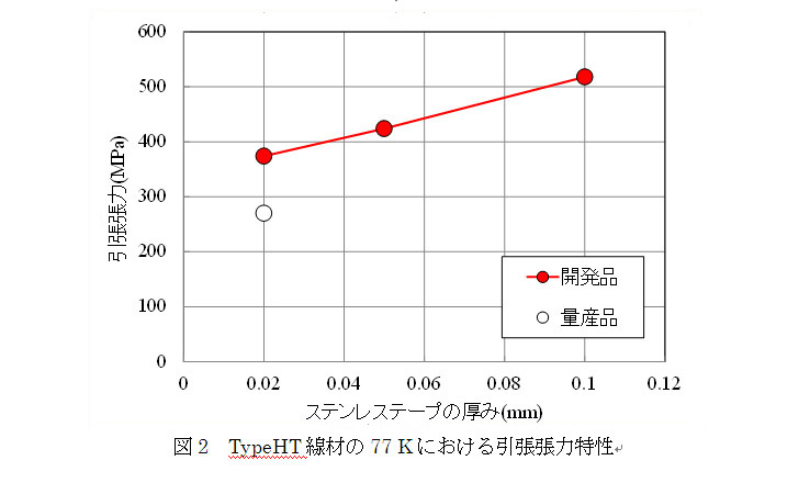 一方、高磁場マグネットや大型ボアを要するマグネット応用では、線材の機械強度が重要になってくる。 DI-BSCCO 線材の場合、機械強度を補強する目的から、ステンレスなどの金属テープを半田付けする手法を使った、 TypeHT を商品化している。 77 K の引張強度のカタログ値は 270 MPa である。今回、補強材であるステンレステープのサプライ張力と厚みを増大させることにより、 77 K での引張強度 500 MPa 、引張歪み 0.5% を達成できる技術に目処を立てた ( 図 2) 。高強度仕様線材についても、近々商品化を計画している。