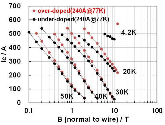 最近の特性改善のトピックスでは、 Bi2223 のキャリアドープ状態の調整により、 77 K における I c は低下するが、低温磁場中での I c 特性は向上する ( 図 1) 低温磁界仕様の技術開発を進めており、商品化を計画している。 Bi 系超電導体は電気的磁気的異方性が大きいため、本質的に磁場下での臨界電流特性に優れない物質と言われるが、材料に合わせた製造条件の最適化は、 Bi2223 線材の超電導特性を改善する。特に Bi2223 線材における金属組成や酸素組成の調整は、 Bi2223 多結晶体の結晶粒間電流特性を改善し、超電導電流特性のさらなる向上を期待させる。