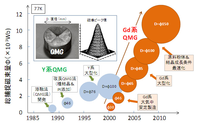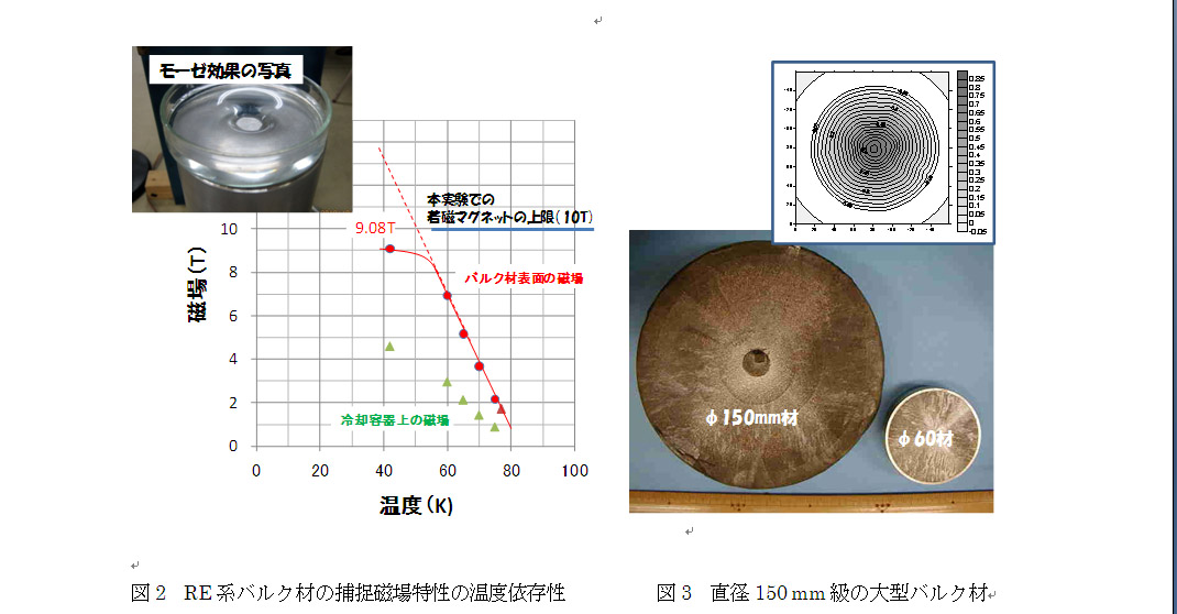 ¡¡ RE ·Ï¥Ð¥ë¥¯ºà¤Ï¡¢ 77 K ¤Ç¤â±Êµ×¼§ÀФòο²ï¤¹¤ë¶¯¼§¾ìȯÀ¸¸»¤Ë¤Ê¤ë¤¬¡¢ÎäÅൡ¤ÈÁȤ߹ç¤ï¤»¤Æ 20~50 K ¤ËÎäµÑ¤¹¤ë¤È 10 T µé¤¢¤ë¤¤¤Ï 10 T Ķ¤Î¹âÊ᪼§¾ì²½¤â²Äǽ¤Ë¤Ê¤ë¡£¤³¤ì¤Þ¤ÇÈæ³ÓŪ¾®·¿¤Î»îÎÁ¤Ç¤Ï 10 T µé¤Î¶¯¼§¾ìÊ᪤ÎÊó¹ð¤Ï¤¢¤Ã¤¿¤¬¡¢Ä¾·Â 30 mm °Ê¾å¤ÎÂç·¿»îÎÁ¤Ç¤ÏÊó¹ðÎ㤬¾¯¤Ê¤«¤Ã¤¿¡£Âç·¿»îÎÁ¤Ç¤ÏÊ᪼§¾ì¤Ë¤è¤ëÅż§ÎϤÎÁýÂç¤Ë²Ã¤¨¤Æ¡¢µ¡³£ÅªÆÃÀ¤òÄã²¼¤µ¤»¤ë·ç´Ù¤Î¾¯¤Ê¤¤¶Ñ¼ÁÀ¤Î¹â¤¤Âç·¿»îÎÁ¤òÀ½Â¤¤¹¤ë¤³¤È¤¬Æñ¤·¤«¤Ã¤¿¤¿¤á¤Ç¤¢¤ë¤¬¡¢ºÇ¶á¤Ç¤Ï¶Ñ¼ÁÀ¤Î¹â¤¤»îÎÁ¤¬ÆÀ¤é¤ì¤ë¤è¤¦¤Ë¤Ê¤ê¡¢´ä¼êÂç³Ø¤Î¶¨ÎϤˤè¤Ã¤Æ¡¢¿Þ 2 ¤Ë¤è¤¦¤Ë¡¢Ä¾·Â 46 mm ¤Î Gd ·Ï¥Ð¥ë¥¯ºà¤Ç 10 T µé¤Î¶¯¼§¾ìÊ᪤¬²Äǽ¤Ç¤¢¤ë¤³¤È¤¬¼Â¾Ú¤µ¤ì¤Æ¤¤¤ë¡£¤³¤Î¤è¤¦¤Ê¶¯¼§¾ì¤Ç¤Ï¡¢¿å¤ÎÈ¿¼§À¤«¤éÀ¸¤¸¤ë¥â¡¼¥¼¸ú²Ì¤òÍÆ°×¤Ë´Ñ»¡¤Ç¤¤ë¡£