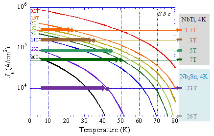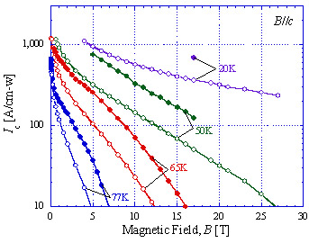 図 3 は、 J e - T 平面上に等磁場曲線を描いたものである。図中には、 Nb 3 Sn 線材及び NbTi 線材の液体ヘリウム温度での J e - B 特性を離散的に示しており、これらと等磁場曲線との交点は、同一の J e と磁場が得られる温度を意味している。例えば、 NbTi 線材 ( 液体ヘリウム温度 ) が 7 T で示す J e 値は、 BHO を導入した GdBCO 線材の場合、同じ 7 T であっても 50 K の温度で得られている。この図から、 BHO の導入と厚膜化によって、 Nb 3 Sn 線材や NbTi 線材を凌駕する実用性能を有する GdBCO 線材が得られるに至っていることが明らかとなった。