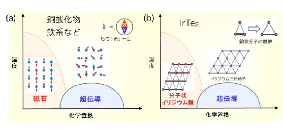 図 1 . (a) 銅酸化物や鉄系超電導体の物性相図。スピンの規則配列を融解すると超電導が発現する。 (b) イリジウム化合物 IrTe 2 の物性相図。化学結合の配列を融解する ( イリジウム鎖の化学結合を切断する ) と超電導が発現する。