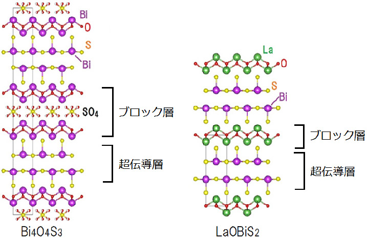 図 1 .典型的な BiS 2 系超伝導体の結晶構造。左図の Bi 4 O 4 S 3 は、実際には SO 4 サイトの一部 (50% 程度 ) が欠損している。