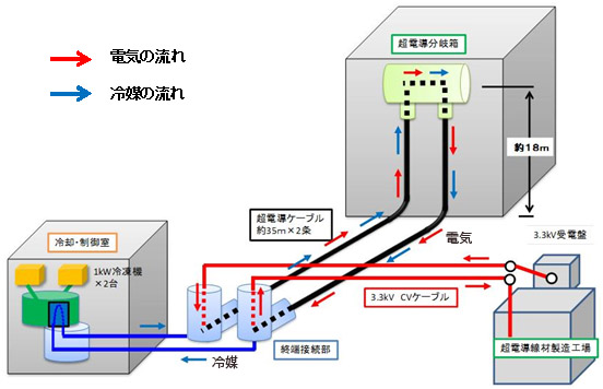本システムは、 2 本の高温超電導ケーブル ( 各 35 m ) 、超電導分岐箱、既設の電力ケーブルと接続するための終端接続部、これらを冷却する液体窒素循環型冷却システム、監視システムから構成されている。
