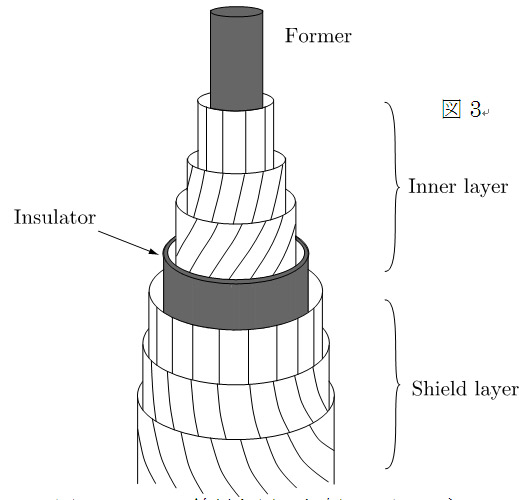 次に縦磁界効果が実現するように内部の導体構造を形成する必要がある。これには、まず巻線部を中空の金属系超伝導体で置き換え、これに縦磁界を加えた場合に超伝導体の中を流れる電流を模擬するようにコート線材を配線すればよい。具体的には縦磁界下の超伝導体の電磁現象に関する知識が必要になるが、内部の電流は局所的に磁界と平行になるように流れることが知られている。つまり Lorentz 力が働かない状態となり、これをフォース・フリー状態という。この場合、内側の導体層も縦磁界効果の一つである常磁性効果により縦磁界を生じ、外側遮蔽層からの寄与との和で、かなり強い縦磁界を作ることができる。縦磁界効果およびフォース・フリー状態の起源に関しては SUPERCOM 99 号 (2009 年 6 月号「 Force-free トルクと縦磁界効果」 ) を参照されたい。フォース・フリー構造の実現の方法の概略を説明すると、最内層ではほぼ軸方向の磁界となるので配線はその方向とし、それより外側に移るにしたがって軸方向の磁界は弱まる一方で周方向磁界が強まるので、それに合わせて配線の角度を強くしていくことになる。図 2 に示す構造では内側導体を流れる電流と、外側の遮蔽層を逆向きに流れる電流が縦磁界を強めあっていることに注目されたい。