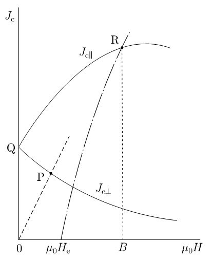 図 3. 横磁界下 ( J c ⊥ ) と縦磁界下 ( J c ‖ ) の臨界電流密度特性および通常の超伝導ケーブルの負荷曲線 ( 破線 ) と新しい超伝導ケーブルの負荷曲線 ( 一点鎖線 ) 。 m 0 H e は外側シールド層が与える磁界。