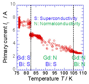 図 1(a) には回転子断面の模式図を、また同図 (b) には試作した回転子の外観写真を示す。かご形巻線には Bi 系高温超伝導テープ材が使われており、鉄心内に Gd 系バルク磁気遮蔽体が挿入されている。図 2 には、電磁界解析結果の一例を示す。磁気飽和が起こっていない通常回転時には、誘導同期トルク発現に寄与する 4 磁 極成分のみが発生している ( 図 2(a)) 。一方で、高トルクが要求される磁気飽和時には、上記 4 磁極に加えて 8 磁極も生じており ( 図 2(b)) 、即ちリラクタンストルクが付加的に発現すると期待される。そこで、 HTS 磁気遮蔽体の効果を検証するため、図 1 の回転子を従来形銅固定子と組み合わせ、昇温過程で実施した無負荷回転試験結果を図 3 に示す。同図では、試作機を液体窒素中で無負荷同期回転状態とし、その後液体窒素を抜きながら昇温過程における回転特性を測定した。同図に示すように、温度 83 K 程度において一次電流が減少しており、このとき Gd 系バルク体の不可逆温度に達したと考えられる ( なお、昇温過程における温度分布の影響によって、特性にバラつきが生じている ) 。また、温度 105 K 程度になるとさらに一次電流が低下しており、この温度は Bi 系かご形巻線の不可逆温度に対応する。つまり、上記両超伝導材料特性が回転特性として明確に現れていると考えられる。以上の結果から、リラクタンストルク発現形 HTS-ISM の実現可能性が示されたものと考えられている。同グループでは、上記成果を 2013 年度春季低温工学・超電導学会 ( 東京 ) で報告 [2] するとともに、第 23 回国際磁石技術会議 (23 rd International Conference on Magnet Technology, Boston, MA, USA) にて発表 [3] する予定である。