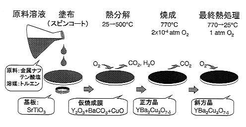 同所無機材料部の水田 進部長、熊谷俊弥、真部高明氏らの研究グループは、1986年の酸化物超電導体発見の直後、この方法によるYBCO系超電導膜の純粋化学的合成を世界に先駆けて実証した。その後も原料物質である金属有機化合物の選定、溶剤の探索、酸素分圧を制御した新規な合成条件の提案、基板の選定等により、性能向上の努力を続け、単結晶的(エピタキシャル)超電導膜の製造技術を確立し、77KにおけるJcとして106 A/cm2以上を達成した。これは他の高価な気相法プロセスで作製される薄膜の超電導特性に匹敵し世界最高レベルのものである。また、格子ミスマッチの大きなMgO基板上においてもエピタキシーを発現させる合成経路を見いだした。塗って焼くだけという簡便な方法を用いて常圧で高性能なエピタキシャル成長膜の作製方法を確立し学術的にも明らかにした意義は大きく、また、大面積・長尺の超電導厚膜の実用化への可能性を評価されたものである。この方法で作製される超電導膜は、大電流制御素子(限流器)、通信用同調回路、電力輸送用ケーブル等への応用が期待されており、現在、北大大西研究室と共同で限流器の試作と評価の研究を行っている。