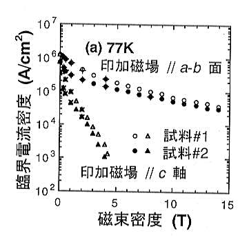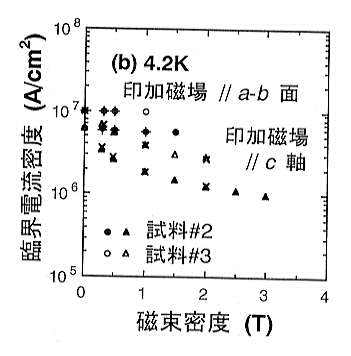 図2 : 作製したエピタキシャルYBCO膜のJc - B特性 (a) 77 K, (b) 4.2 K.