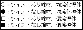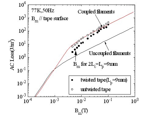 同グループの発表によると、幅3.3 mm、厚さ0.18 mm、銀比3.5の55芯の銀シースBi2223テープで、Jc = 14,300 A/cm2の臨界電流密度をもつ長尺線材の開発に成功した。また、同グループが実施した素線での交流損失の測定結果では、周波数50 Hz、磁場振幅Bm = 9.8 mTの交流外部磁界中で、素線の交流損失は12 J/m3で、Bm = 23 mTで41 J/m3であった。これはツイスト無しの線材の交流損失がBm = 9.8 mTで24 J/m3、Bm = 23 mTで67 J/m3あることから、40〜50%の交流通電損失の低減が図られたことになる(図1)。