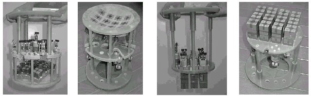 これは、磁束検出コイル(ピックアップコイル)として30×30×60 mmの直方体(材質 : TIポリマー)に超電導線(NbTi)を用いて三成分が直交するように巻き、二次勾配型を形成させた構造になっており、一点で磁界の三成分が同時に測定が実現できるものである。脳磁界測定用として3行×4列の曲面上に配列させたもの(写真1)、心磁図用とて3行×4列の平面上に配列させたもの(写真2)で36個のdc−SQUIDに接続され、ノイズ検出用として磁束検出コイルにさらに3個のSQUIDが使用され、合計39チャンネルのSQUID磁束計となっている。したがって、心磁図用には、底面が平面状のLHe冷却用デュワ、脳磁図用には、底面が曲面状になった冷却用デュワの2 種類が用いられるが、SQUID部と磁束検出用コイルは一体化され、この部分が取り替えられるカセット式になっているのが一つの特徴とも言える。これにより12点で同時に三次元磁界計測が実現され、36チャンネルの磁界出力信号が得られる。