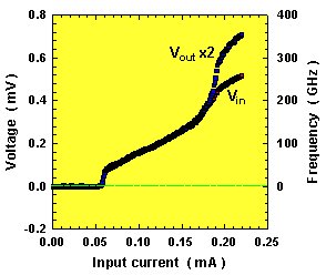 SFQ回路における電圧パルスは高さがmV程度、幅がpsecのオーダーであるために、現状のいかなる計測器をもってしても、これを直接測定することはできない。このため、回路の動作周波数を求めるには、パルスの通過する端子間の平均直流電圧を測定し、これを1つのSFQパルスの面積(2.07X10-15 Vsec)で割ることで、毎秒何個のパルスが通過したかを算出する、という方法が用いられる。分周回路では発信器で生成されたパルス列のうち、2つに1つだけがT-フリップフロップの出力端子を通過する。したがって、回路が正常に動作している場合には、出力端子での平均電圧 (Vout)が、発信器端での平均電圧 (Vin)の1/2に一致していなくてはならない。図2は温度12 Kでの測定結果を示したものである。Vinとして0.4 mVまではVin=Voutx2の関係が成り立っていることが分かる。これは、今回開発された分周回路が200 GHzの繰り返し周波数を持つパルス列まで正しく動作していることを示している。