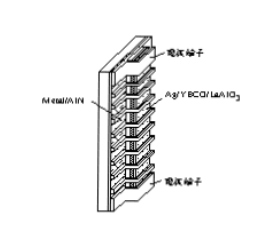 実際に作製した素子は幅10 mm、長さ100 mmのLaAlO3基板上にレーザー蒸着法を用いて作製した厚さ1 mmのYBCO薄膜を、幅30 mm、長さ100 mmのAlN基板上に作製した金属薄膜の上に置き、10 mm間隔でYBCO薄膜と金属薄膜の間を並列に接続した構造をしている(図1)。限流試験の結果よりこの構造にすることで、単位長さ当たりの印加電圧を今までより3倍以上大きくできることを確認した。