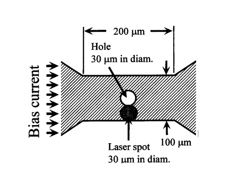 同グループは、これまでに、フェムト秒光パルスによる高速電流変調を用いれば、超伝導領域の相転移を伴わずに超伝導リング中の磁束が、制御・変調できる可能性があることを指摘してきた。その第1段階として、前回、図1に示す構造(幅100 mmのストリップラインの中心に直径30 mmのホールを空けたもの)の超伝導リングを用いて、一方から電流バイアスを印加した状態で、図中レーザースポットに、フェムト秒レーザーを照射し、バイアス電流を除いた後に、レーザースポットから放射されるテラヘルツ電磁波から、中心のホールに磁束が生成されている可能性を報告してきた。