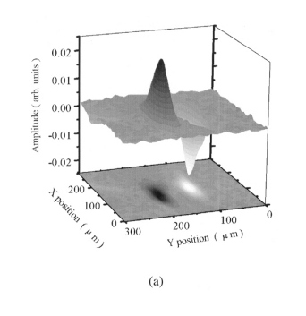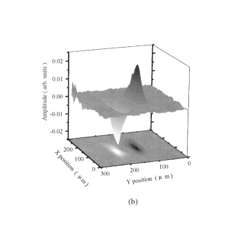 今回、この状態での超伝導電流の分布を可視化することで、この裏付けをとることに成功した。図2 に示すように、磁束を生成した後のリング付近での電流分布から、ホールの周りに超伝導電流が流れている様子が明瞭に観測されている。このマッピングは、検出器としてボロメーターを用いたときであるが、低温成長GaAs光スイッチを用いることで、X方向に流れる電流の向きと大きさを観測することができる。その結果を、図3(a)に示す。ここで、中心のホールはX=125 mm、Y=150 mm付近にあるが、対向するブリッジで逆向きにほぼ同じ大きさの超伝導電流が流れていることがわかる。これらの結果から、中心のホールに磁束が生成され、電流が周回していることが証明された。更にこの状態から、逆方向に同じ大きさのバイアス電流を印加し、同じ処理を行うことで、図3(b)のように逆向きの電流が観測されており、磁束の向きが反転している様子が観測されている。