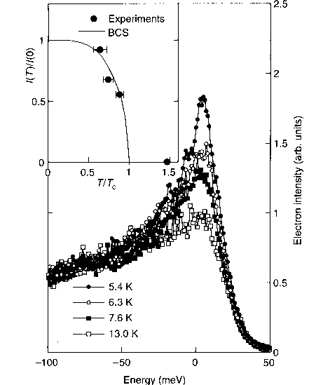 本実験では、超高真空中の低温ステージにマウントされたニオブがティップとして用いられ、放出電子のスペクトルが1 meV以下のエネルギー分解能で測定された(図参照)。ニオブの超伝導転移温度(9.2K)以下で、フェルミエネルギー(E=0 meV)近傍に単色電子放出を示す鋭いピークが発達している事がわかる。また、このピークの強度の温度依存性は、内挿図に示すように、ギャップパラメータの温度変化と対応している。このような単色電子放出検出の試みはこれまでにもなされてきたが、いずれも成功していなかった。早稲田グループはティップを電解蒸発によって常に清浄に保つことがこの現象を観測する上で重要であることを指摘している。実際、残留ガスが吸着したティップではこのような現象は観測されなかったという。観測されたピーク幅は約20 meVと理論的予想よりかなり広いものの、試料の質の向上などで改善の余地があるという。