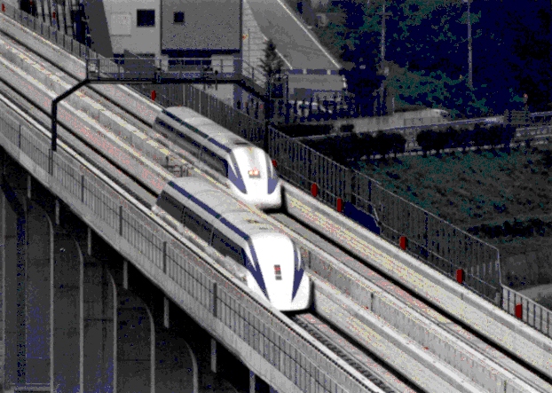 1998年に入ってからは、2編成の車両を使用した総合的な走行試験が実施されました。その中では、列車同士のすれ違い走行試験が代表的な確認項目となりましたが、そのほかに、複数の電力変換器を使用してそれぞれの担当領域をスムーズに渡る運行方法の確認等、将来の営業線に向けて不可欠な各種条件におけるシステム確認も行なわれました。すれ違い走行に関しては昨年の暮れに相対速度966 km/hが確認されましたが、これは片方の車両が504 km/h、もう一方が462 km/hで走行するという試験であり、当然これも他に例を見ない世界初の組み合わせでの走行試験となっています。