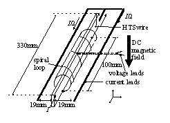 通電損失は電圧端子法により測定しているが、電圧端子リード線を試料テープ周囲に螺旋状に引き回す点に特徴を有している。この方法をスパイラルループ法と呼んでいる。テープ線材では、よく知られているように、丸線と異なり周囲にできる磁界が周方向に対して一様でない。従って、従来行われていたように矩形のリード線の引き出し方法を採用すると、矩形を十分大きくしないと正確な損失測定ができない。これに対し、スパイラルループ法では、最小でテープ幅を直径とする円筒面上にリード線を巻き付ければよいので省スペースである他,外部交流磁界とリード線ループが結合せず、交流磁界下での通電損失測定に適用できる点も大きなメリットである。
