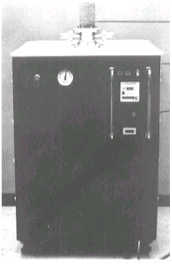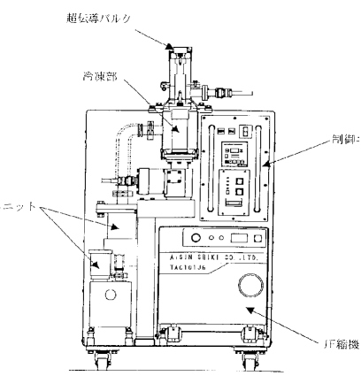 従来の磁場発生の手法としては、永久磁石、または銅線あるいは超伝導線を用いた電磁石があるが、前者は小型で扱いやすいものの発生磁場が小さい、後者は発生磁場が大きいものの装置が大型になるという特徴を持つ。そこで、名古屋グループでは試作をするにあたって、電磁石よりもコンパクトであり、かつ十分に大きな磁場を手軽に発生することができる装置を目標とした。そのため、超伝導体の冷却には冷凍機によって機械的に冷却する方式を採用し、冷凍機、圧縮機、および制御系などを530×520×760 mm3のラック内に組みこんだ。使用している冷凍機の出力は0.8 kWと小さいが、冷却を要するのは直径36 mm、高さ14 mmの溶融バルク体のみなので、試料温度は33 Kまで下がる。図1に装置の外観を、また図2にはその構成図を示す。装置の上に出ている部分が磁極になっており、断熱層を隔てた低温部に溶融バルク超伝導体が組み込まれている。