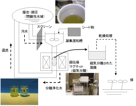 この技術は次の2つの意味で新技術と言える。まず、超伝導磁石を使用した高勾配磁気分離システムを利用している事と、凝集剤の使用を極力押さえている事である。超伝導高勾配磁気分離システムでアオコを分離する方法は最近報告されたが、アオコを分離するために大量の磁性粉(マグネタイト)や凝集剤(硫酸バンド)を混入するため、アオコの量以上の凝集剤を必要とし、二次廃棄物の発生が問題となっている。また、大量の凝集剤を使用するため、被分離体を土壌改良材や有機質資材として使用する事が困難であった。今回開発した技術はこれらの問題を解決し、被分離アオコを土壌改良材としても使用できるのが特徴である。また、アオコをリンや窒素の生物担体と考える事で閉鎖水系の浄化に役立てることもねらっている。