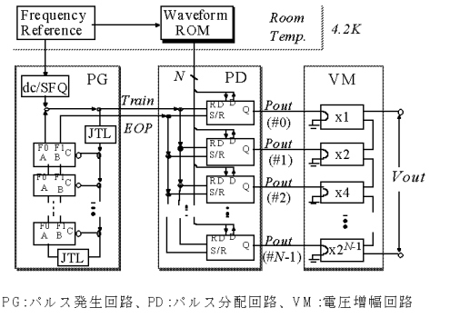 同コンバータは、10 MHzの外部基準信号を基に、4.2 Kに冷却されたチップ上で10 GHzクロックのSFQパルスを発生する回路(『パルス発生回路』)、発生したSFQパルスを分配する回路(『パルス分配回路』)及びSFQパルスを入力線に与えることによって高精度電圧を発生する回路(『電圧増幅回路』)から構成される(図を参照)。これら3つの要素回路の内、『パルス発生回路』と『パルス分配回路』は、独自のアイデアに基づいて設計を行い、電子技術総合研究所内に整備されたジョセフソン接合集積回路作製ラインを用いて試作された。試作された回路の評価は、数100 Hzのデジタル信号をdc/SFQ変換回路を通して入力させ出力をSFQ/dc変換回路を通して読み出す方法によって行い、正常な動作が行われていることが確認された。『電圧増幅回路』についてはニューヨーク州立大学のPolonsky博士が考案した回路を採用することにしており、その基本動作については、米国Hypres社において作製されたチップによって、Polonsky博士らによりすでに確認が行われている。