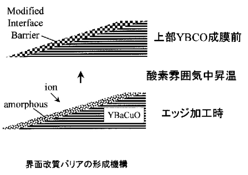 これらの結果から、両研究グループでは界面改質バリアの形成機構を以下のように推測している。図に示すようにエッジ加工プロセスの間、下部電極YBCOエッジ表面はイオン照射によりダメージを受け、アモルファス化する。このとき、このアモルファス層の組成は選択スパッタリングにより123組成からずれる。次に酸素雰囲気中で上部YBCOの成長温度まで試料が加熱されている間に、このアモルファス層が結晶化すると考えられる。この結晶化した層が界面改質バリアの正体であり、Baベースのペロブスカイト構造を持つ化合物(Y1-xCux)BaOy(x<0.5)であると推定している。