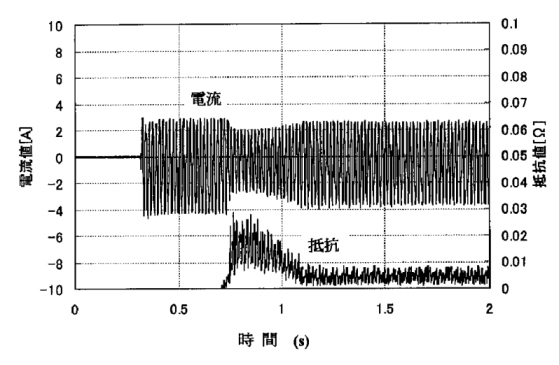 最終的に少しノーマル領域が残るが、原因は冷却の悪いヒータ近傍まで縮小しそこで停留したためである。ヘリウムガス冷却でもほぼ同様の結果を得た。これらの検討より、超伝導復帰の条件はコイルに生じる電圧降下の大きさ(サイリスタバイパスの場合0.8 V〜1.5 V)、コイル抵抗および冷却の三者に依存するが、その最適値の選定により十分安定化できる見通しを得ている。なお、本冷凍方式は限流動作その他の諸特性に対して全く問題がないことをシミュレーション等で確認している。これにより、さほど冷凍を意識させないメンテナンスフリーに近い冷凍機冷却型超伝導限流器の実現に見通しを得たとしている。