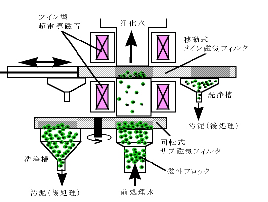 磁性体の金網等を積層した磁気フィルタを電磁石の両端磁場内に配置し、前処理した汚濁湖沼水を通水する。磁気フィルタの細線の周囲には磁束線が集まって非常に大きな磁気勾配が生じるので、磁性フロックを強力な磁気力で吸引・捕捉できる。捕捉後磁気フィルタを磁場外に移動すれば磁気力は消滅し、捕捉した磁性フロックを磁気フィルタから簡単に洗浄除去できる。試作された装置は、磁性フロックを生成する前処理部、磁性フロックの捕捉分離と洗浄除去を行う連続磁気分離部、および脱水、磁性粉の回収を行う後処理部から成り、一貫かつ連続的に処理できるシステムで400m3/日の処理能力を有している。