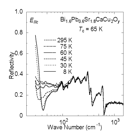 図は様々な温度で得られたBi(Pb)2212単結晶(Tc = 65 K, オーバードープ)のc軸反射率スペクトルである。スペクトルがTc以下で劇的に変化し、検出限界(30 cm-1)より十分高い40 cm-1付近に鋭いエッジが観測されていることがわかる。LSCOやYBCOにおけるスペクトルとの類似性より、これはジョセフソンプラズマエッジの出現を示していると考えられる。スペクトルの解析から見積もられるlcは12.6 mmであり、最適ドープのPb無添加Bi2212の値: lc ~ 100 mmと比べると1桁近くも小さいという。