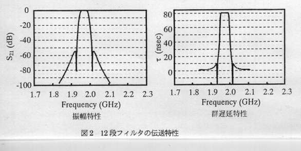 これまでの開発で、同社は、従来設計が困難であった非最小位相推移回路を用い、通過域で振幅特性と群遅延特性が同時平坦で、阻止域で伝送零点を有するフィルタの実現方法を構築した。従来一部でわずかに経験則的に楕円関数を用いてこの特性に近づける試みがなされていたが、群遅延特性については要求特性とは程遠い状態であった。京セラのグループは、正確にこの特性のフィルタを設計する理論を確立し、合わせて実際のストリップ構造のフィルタパターンに変換する一連のプロセスを世界で初めて完成させたもの。図2は設計したフィルタの伝送特性(回路シミュレーション)である。同グループの武田重喜氏は「理論が複雑で、また、実現するための良い素子材料が無いために、四半世紀前に姿を消した非最小位相推移回路による低波形歪みのフィルタですが、超電導材料の出現と、ディジタル移動体通信の高度な発展で、再び着目されて実用化されようとしているのは感無量です」と語っている。