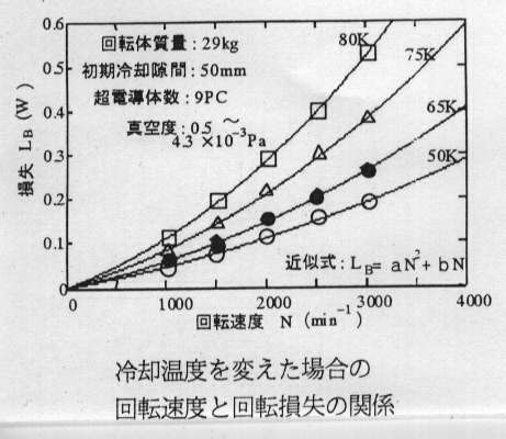 本装置を用い、1kWhフライホイール装置で製作した、アキシャルギャップ型の超電導磁気軸受の軸受単独性能について、冷却温度及び初期磁場条件等のパラメータ試験を行った。特に回転損失は、80Kと50Kの比較では、約1/3と大幅な改善が確認できた。 実用面で本軸受は、冷却温度65 K、初期隙間20 mmが適当なことを確認、超電導磁気軸受の回転数による損失の変化については、回転数の一乗及び二乗に比例する項に分けることにより、良い近似を得る事が出来た。