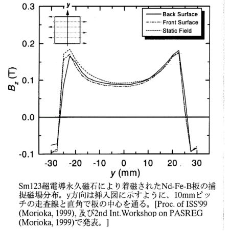 水谷教授らは彼らのグループで開発したAg添加Sm123系超電導バルク体を冷凍機で35Kまで冷却し7.2テスラの磁場で着磁することにより、その表面で6.7テスラ、真空容器の外の自由空間で3.2テスラの磁場を発生させた。着磁された超電導体はその中心軸上に鋭く絞られた強力な磁場を発生するので、超電導永久磁石を着磁すべきNd-Fe-B板上で走査させることによりその着磁を試みた。図には50mm×50mm×5mmのNd-Fe-B板上を10mmピッチで走査して得られた捕捉磁場分布を示す。捕捉磁場は走査方向に直角で板の中心を通る線に沿ってホール素子を用いて測定した。中央の値が低いのは板の形状による反磁場効果のためである。走査したことによる捕捉磁場の乱れは見られない。また、着磁された板の表と裏で分布に差はない。さらに、3テスラの均一磁場で着磁した場合の結果とも有意な差がないことから超電導永久磁石を走査させることでNd-Fe-B板が完全着磁出来たことがわかる。