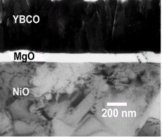 SOE法の最大の特徴は2軸配向したNiO層を形成する技術にある。そのためには圧延加工されたニッケルテープに熱処理を加えて、金属組織を2軸配向化させる。このテープを表面酸化させると、テープ表面にNiOが形成されるが、このときNiOが金属基板表面に対してエピタキシャルに成長する条件を選ぶことでNiOを2軸配向化させることができる。NiO層はYBCO膜と下地のニッケルテープとの反応抑制に利用されるとともに、2軸配向性を有しているため、この上に2軸配向したYBCO膜を成膜することができて高Jcが実現できる。