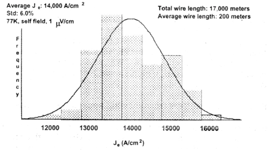 図に示されるように、ASC社は17 kmの長尺線材製造において、素線の平均エンジニアリング臨界電流密度JeとしてJe=14 kA/cm2(最高16 kA ,最低12 kA)を達成したと、報告している。これらの値はASC社の目標値10kA/cm2を十分上回り、多くの応用に対する技術的要求を満たすものであるが、経済的観点からすれば、さらに高いJeが要請されるだろう。ASC社製線材の性能は、この1年間の最適化努力によって8 kA/cm2から14 kA/cm2に向上した。L.Masur氏によればASC社の長尺線材のこのような性能は、他社線材の公表値に比べ、2倍高い値である。同氏はまた、ASC社はBi系テープの機械的強度を改善するユニークな方法を見出したとも語っている。