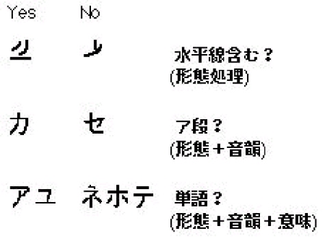 fMRIは空間分解能にすぐれ、MEGは時間分解能にすぐれており、両装置を使用することにより、脳活動についての詳細なデータを得ることが期待される。同所、知覚機構研究室の脳機能研究グループでは、これまでにも視覚的注意、言語、視覚探査、運動学習など様々な処理を行なう際の脳活動を明らかにしてきた。例えば言語では、カナ文字やこれを変形して読めなくした疑似文字など(図3)を使って処理を段階的に含む課題を実験し、刺激呈示後0.2秒までに後頭・側頭部で形態処理が、0.2から0.5秒で側頭・頭頂・前頭部などにおいて音韻ないし意味処理が行なわれるとの結果を得た。また同研究棟には大阪大学柳田敏雄教授の研究プロジェクトのメンバーも常駐し、これらの装置を使用した研究の他、近赤外光による脳機能計測の研究も行なっている。