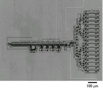 磁束量子回路は信号レベルが0.1 mVと微弱であること、および極低温に冷却された治具の中に組込まれているために、超高速信号を処理できるにもかかわらず、その高周波信号を外部に取出し、室温で利用することが困難であった。今回日立の作製した磁束量子回路はリング発振器と分周回路およびインターフェイス回路から構成された。リング発振器で発生した42 GHzの高周波を分周回路で周波数を1/32に分周し、インターフェイス回路で電圧増幅することによって高周波信号を取出すことができた(図1、2)。