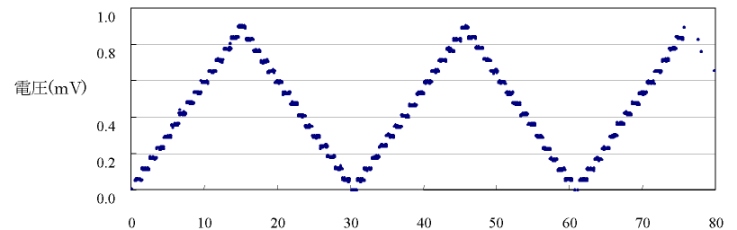 今回試作された4ビットD/Aコンバータのチップサイズは4.9 mm×4.9 mm、用いられているジョセフソン接合(Nb/AlOx/Nb)の総数は約1,700個、接合の最小寸法は2.8 μm×2.8 μmである。外部回路から与えられたデジタル・コードによってD/Aコンバータの出力振幅が変化させられる(図)。今回の試験では、任意の電圧を発生させるために必要なSFQパルス(30GHz)は、定電圧バイアスされたジョセフソン接合によって供給されたため標準素子としての電圧精度は得られていない。今後、D/Aコンバータ内部に組み込まれたパルス数逓倍回路をSFQパルスの発生源として使用し高精度電圧の発生及び評価を行うとのことである。