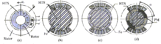 バルク超電導体の磁気ヒステリシス現象を利用したヒステリシスモータ( 図(a))については、現在までに従来機と比較しても5〜7倍の特性向上が得られているが、高速度・高出力化を目指して4kW級のモータの試験がIPHTにおいて行われた。サイズはステータ長×ロータ直径(以下、同じ)が70 mm×φ40 mmである。同期回転数は12000 rpm ( 電源周波数200 Hz )と24000 rpm( 同400 Hz )の2種類で、固定子電流を120 A程度まで流して液体窒素中で試験し、高速回転時においても3〜7倍の特性向上が得られている。