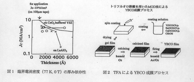 その作製プロセスであるが、図2に示すようにY, Ba, Cu各々のTFA塩の混合メタノール溶液を基板に塗布し、2回の焼成を行うだけの極めて簡便な方法である。ただし、焼成段階でフッ素化合物を追い出すために、酸素、湿度を微妙にコントロールする必要がある。今回、超電導工学研究所が開発した方法は、特に原料調整に工夫を施しJcに有害な炭素の残留を減らすようにしている。通常、こうした有機の塩を使う方法ではBi系で知られているように、炭素が残り易く、これが粒界などに偏析し、Jcの大幅な低下をまねく。このため、開発初期段階から炭素の残りにくい系を原料にすることを目指したという。確かに、これまでに報告されている米国のJcと比較すると、同程度の膜厚、例えば、5000 Aのものでは2×106 A/cm2級に対して超電導工学研究所の値3.6×106 A/cm2は倍近い高い特性である。