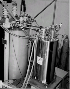 新たに開発された『過冷却液体窒素冷却システム』は、真空断熱されたステンレス製容器に冷凍機2台と循環ポンプを組込み、真空断熱された配管で変圧器本体と連結されている。また、変圧器本体の液体窒素搭載量330リットルに対し、液体窒素の循環量は毎分4リットルであり、装置全体では77Kで約300 Wの冷凍能力を有している。