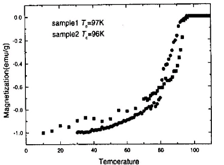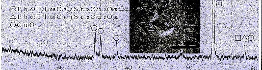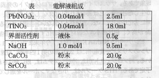 製法プロセスの概要は、50mlビーカ中に表のような組成の電解液を入れ35℃に保ち、銅板を陽極とし、陰極として白金板(鉛等の他の金属でも可能)を用いた。電析条件は、電流密度が2.5〜3.0(mA/cm2)の定電流で、時間は15分〜20分で電析した。焼結は、約 920℃の電気炉で4時間程度焼結すると約0.01mmの薄膜が得られ臨界温度は96 Kだった。X線回折、SEM写真および温度特性の結果は図のようであった。