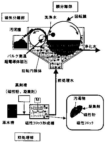 連続的に浄化できるように膜を回転ドラム状に構成し、前処理水を膜の外側から内側に通す。磁性フロックは回転膜面上に捕捉され、原水は浄化されてドラムの内側から浄化水として放出される。水中の膜面上に蓄積した磁性フロックは、回転により前処理水の水面近傍に配置したバルク高温超電導体が発生する高磁界の領域に移動し、水面近傍で膜内部から供給されるシャワー状の洗浄水の水流とバルク高温超電導体の磁気力により、磁性フロックは膜から剥離されるとともに、膜面を洗浄し再生し、剥離した磁性フロックは、磁気吸引力により水中を磁石側に高速移動する。冷凍機で冷却し真空断熱容器に内臓した着磁済みのバルク高温超電導体は、非磁性の回転円筒体の内部に静止固定されており、移動した磁性フロックは円筒表面に磁気吸引されて付着し、円筒の回転にともなって水面上の大気空間に移送される。ここで、磁性フロック中の余分な水分が流下し高濃度の汚泥となり、この汚泥は掻き取り板で円筒体表面から剥ぎ取られ、汚泥貯槽に落下する。この時、円筒体表面が再生される。この一連の作動によって、原水は連続的に浄化され高濃度の汚泥が連続的に排出される。