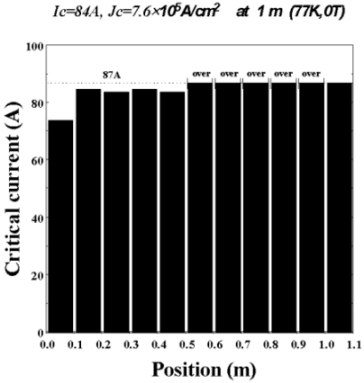 (株)フジクラにおいては、超電導応用基盤技術研究開発のプロジェクトとして、誘導放電式の66 cm長の大型矩形イオンソースを用いて、長時間連続運転を行う試みを開始した。これまでのところ、ずれ角Δφ=12〜13°にYSZ層が配向した5.6m長のテープが形成されており、作製速度については0.3 m/hで同等の配向性を保つことを確認している。設備の性能上は、YSZで0.5 m/hまで対応可能と見られている。イオンビームの収束性改善により、従来のテープ材よりも配向性が向上しており、上記中間層上で、1m長にてIc=84 A、Jc=0.76 MA/cm2のYBCO膜が形成された (図) 。また、YSZと同様のZrを含む螢石構造系の酸化物材料で、他元素をドープした材料において、配向速度が約2倍となることが見出されており、本設備を用いて1.0m/h程度の合成速度が期待される。この材料においても微細構造観察でYSZと同等の結晶粒径、表面平滑性が確認されており、Ic=98 A、Jc=0.65 MA/cm2の短尺YBCOが形成された。