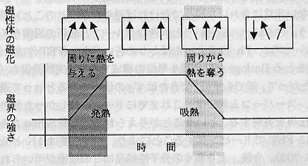 中部電力と東芝が開発に成功した磁気冷凍システムは、磁性体に磁界をかけていくと磁性体が発熱し、磁界を取り去ると温度が下がる現象(磁気熱量効果)を利用している。磁性体が冷えるのは、外部の磁界により磁性体中の磁化の向きを揃えられている状態から磁界を弱くする(ゼロにする)と、磁化の向きがバラバラとなり磁気エントロピーが増加するためである。この時、磁性体の周りから熱を奪うため、冷凍を行なうことが可能となる。